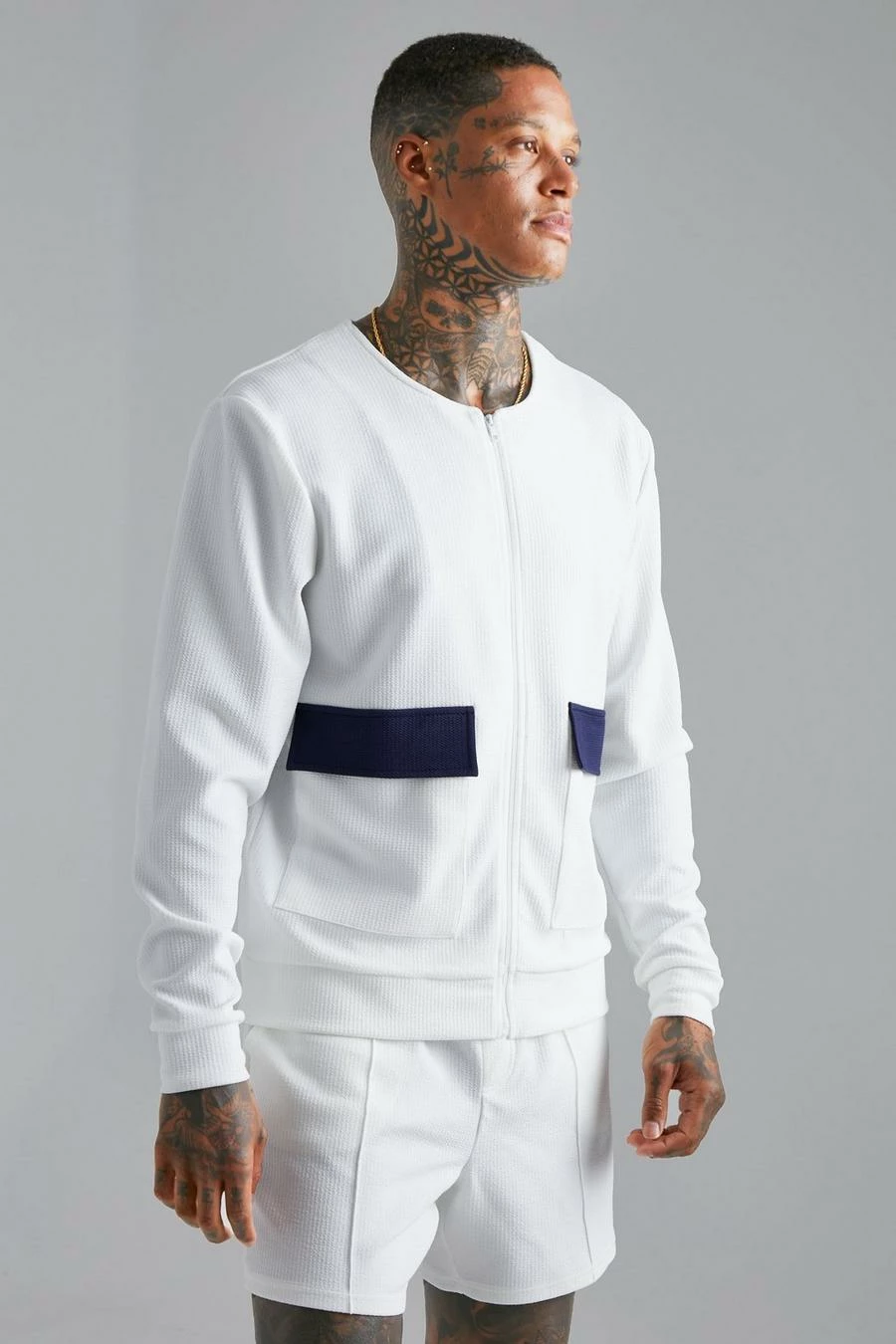 Ecru Jersey Textured Bomber, T-shirt And Short Set Ecru