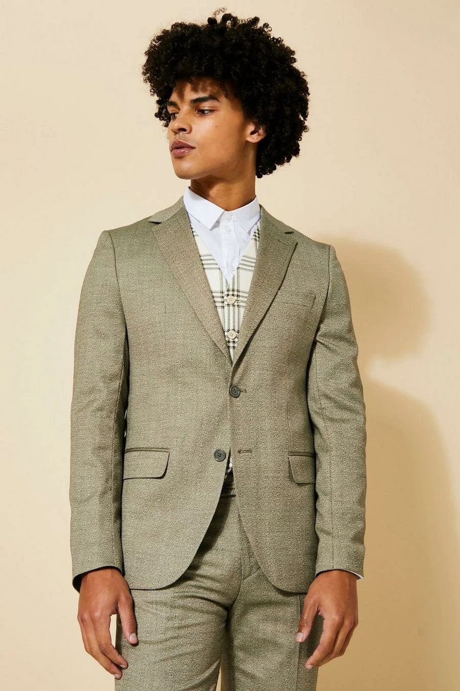 KHAKI SLIM CHECK SUIT JACKET, TEXTURED WAISTCOAT AND TEXTURED TROUSER Khaki