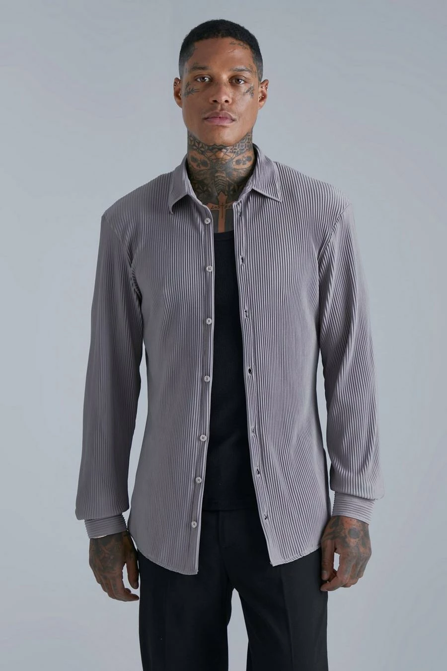 Long Sleeve Pleated Slim Fit Shirt Taupe