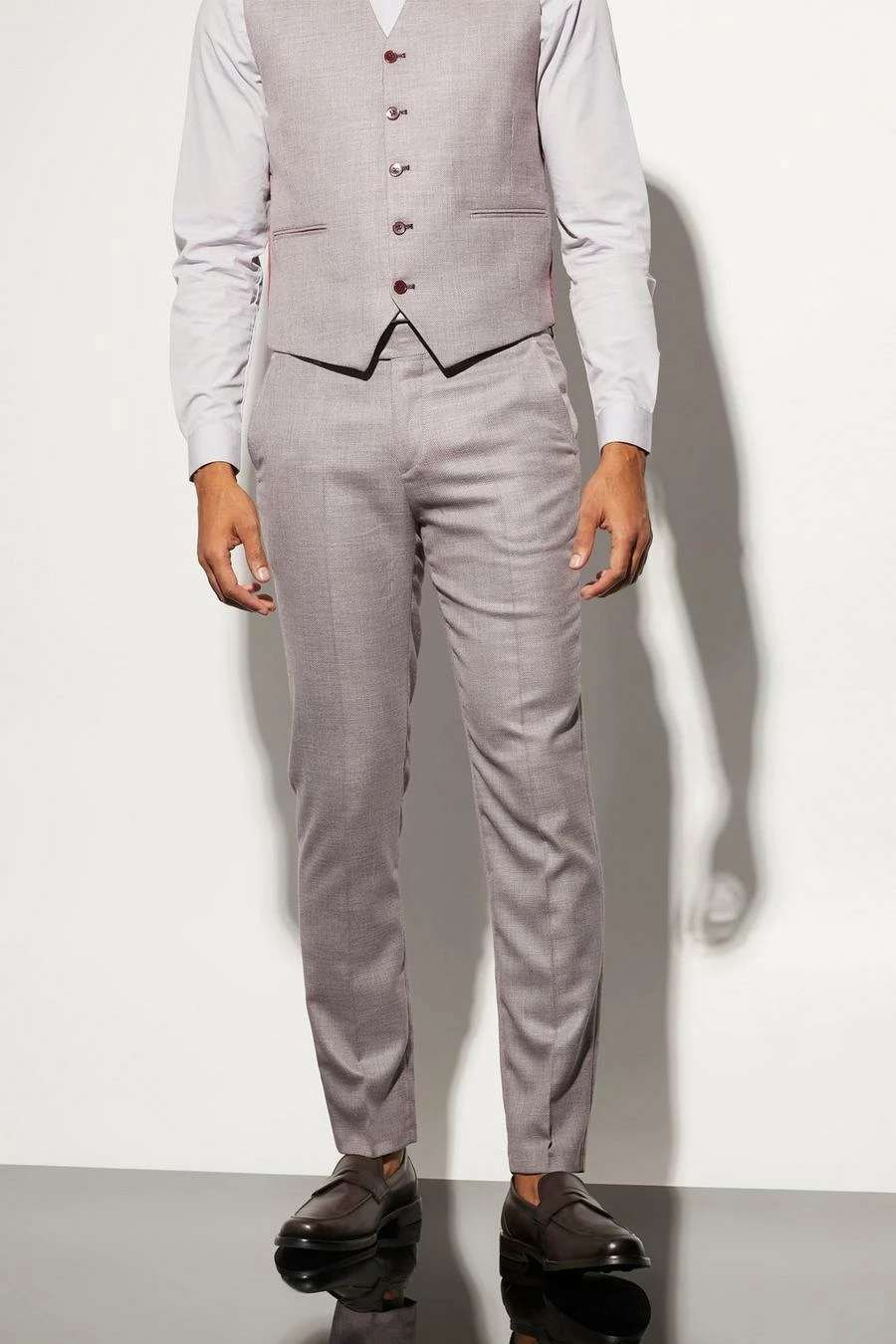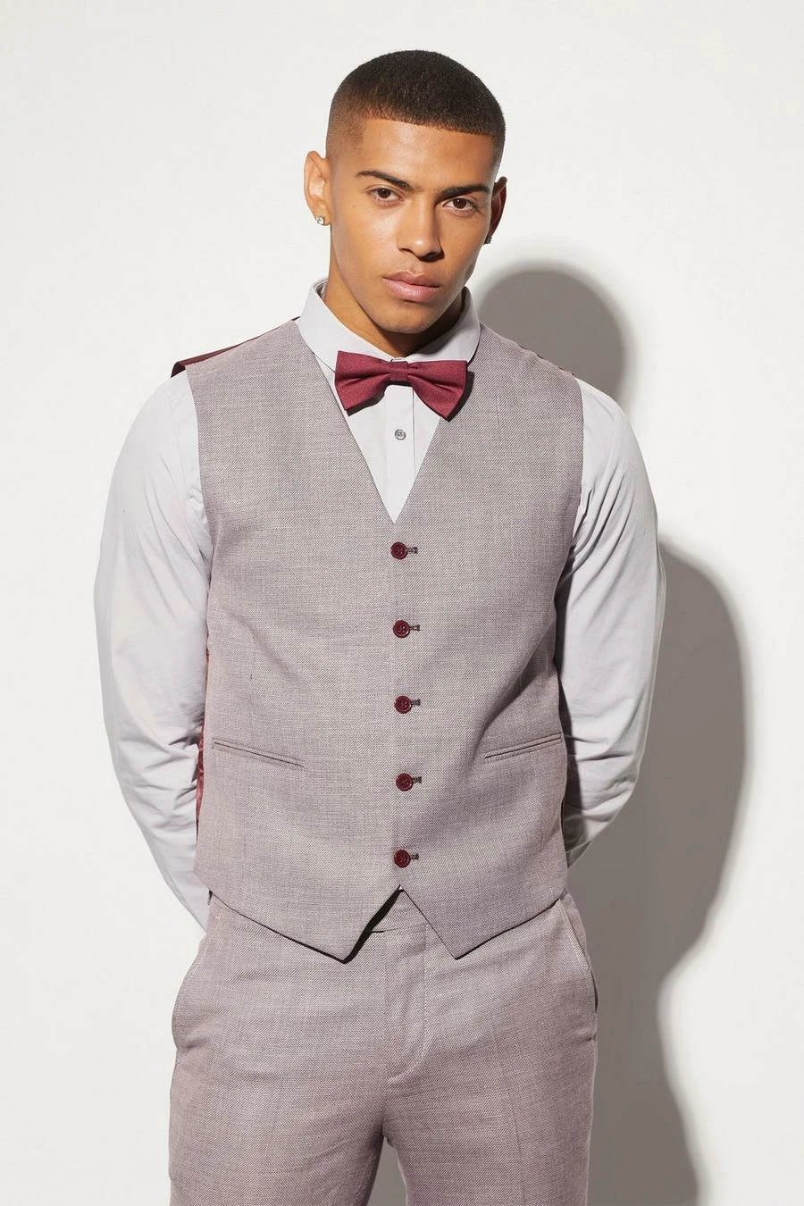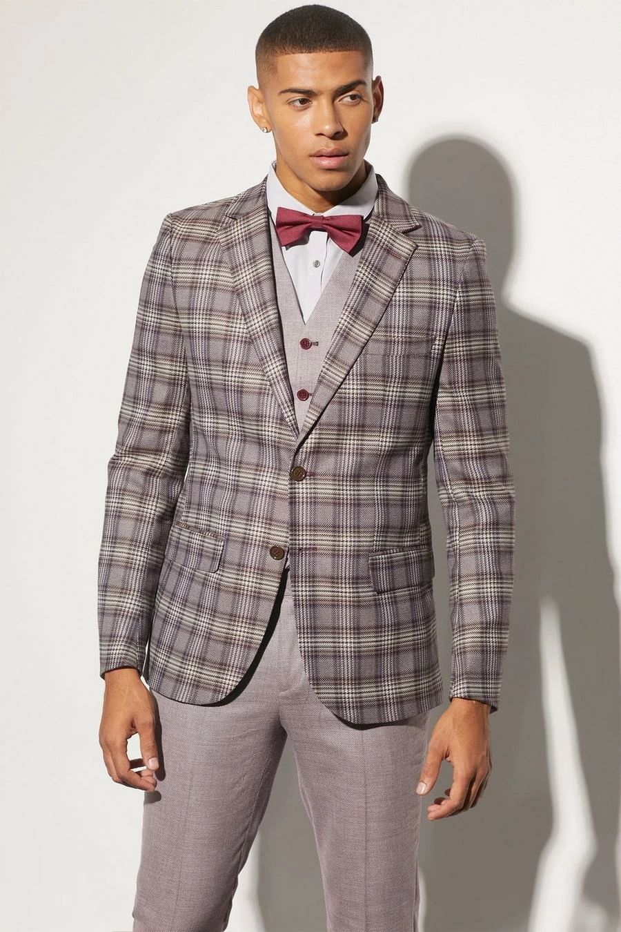 RED SLIM CHECK SUIT JACKET, TEXTURED WAISTCOAT AND TROUSER Red