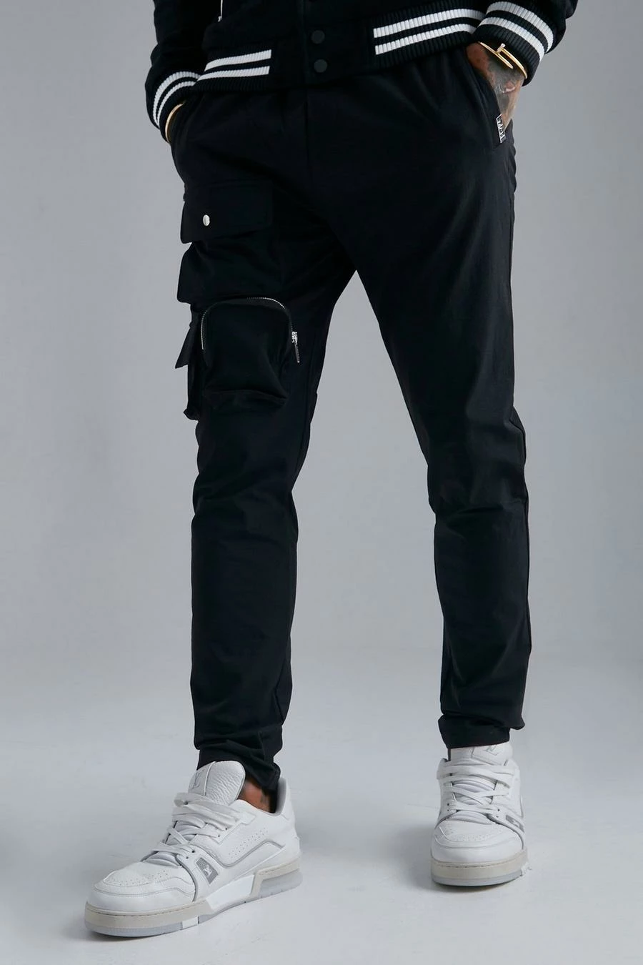 100% Polyester. Model is 6’1 and wears size M.